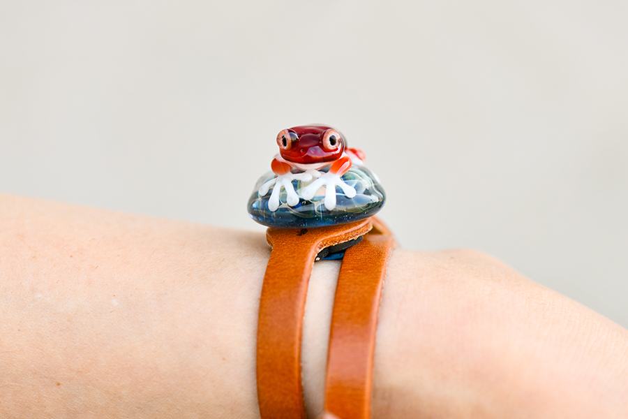 腕に身に着けると、そのかわいらしいカエルたちと目が合う瞬間を楽しめます。
